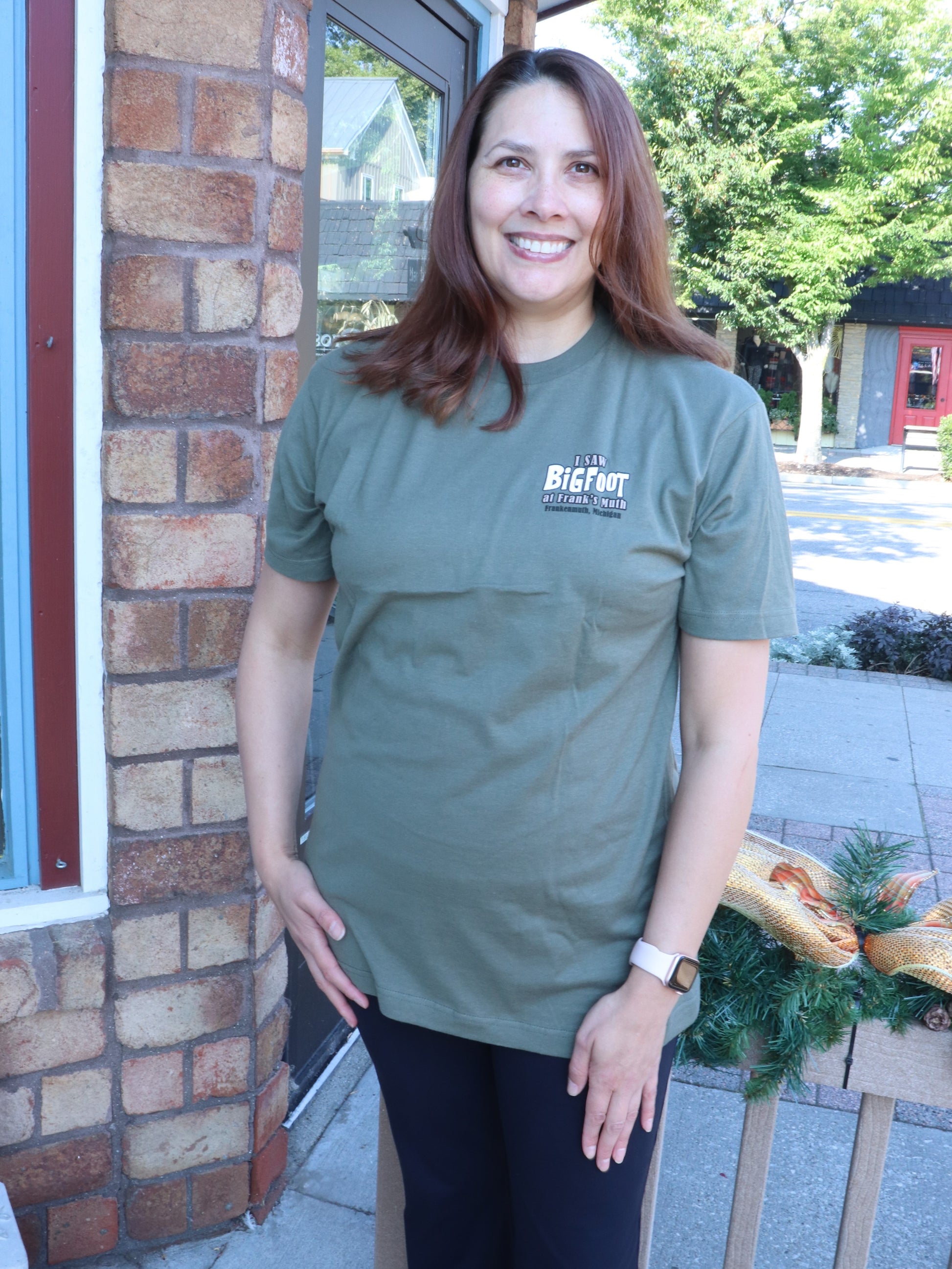 Show off your Bigfoot sighting with our “I Saw Bigfoot at Frank’s Muth” T-shirt. This short-sleeve tee features a playful headshot of Bigfoot rocking a hat and sunglasses, with the text highlighting your legendary encounter at Frank’s Muth in Frankenmuth, Michigan. Made from soft, breathable cotton with a classic fit, it’s a fun and comfortable keepsake for fans of the mysterious - and a perfect gift for anyone who loves a little local flair.