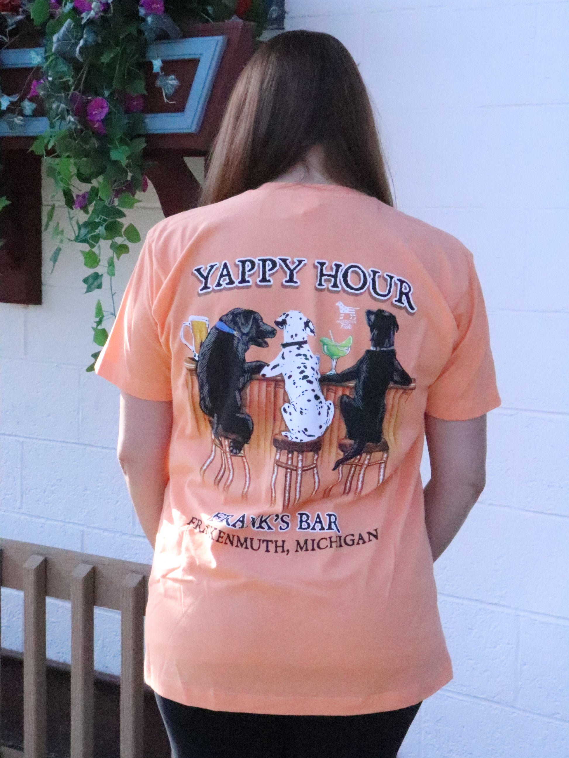 Raise a glass to good times with our “Yappy Hour” T-shirt. This playful design shows three dogs perched on bar stools, enjoying their favorite drinks at Frank’s Bar in Frankenmuth, Michigan. Made from soft, breathable cotton with a classic short-sleeve fit, it’s as comfortable as it is fun. Perfect for dog lovers and anyone who enjoys a little humor with their hometown pride.